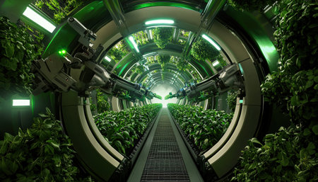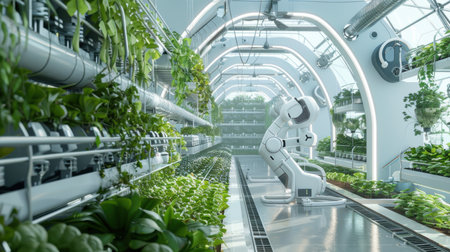 Robotic Arms Tending Plants in a Futuristic Greenhouse