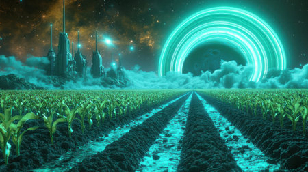 A vibrant agricultural field stretches forward, showcasing rows of crops. In the background, a fantastical city glows with neon lights beneath celestial rings and swirling clouds.