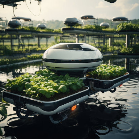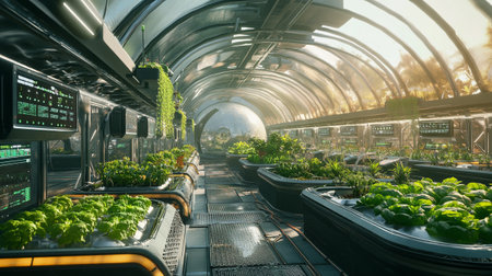 Discover a futuristic hydroponic system that showcases advanced technology in urban agriculture. Lush green plants thrive in a sustainable environment, highlighting innovation in food production and eco-friendly practices.