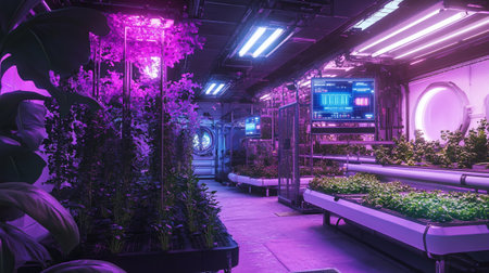 Modern greenhouse using hydroponics with colorful neon lights growing fresh vegetables and herbs
