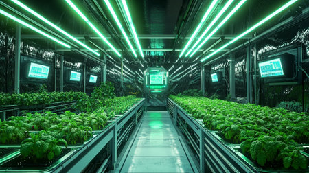 This image captures a modern hydroponic farm featuring vibrant plants thriving in a high-tech environment, emphasizing innovation in sustainable agriculture and efficient growth methods.