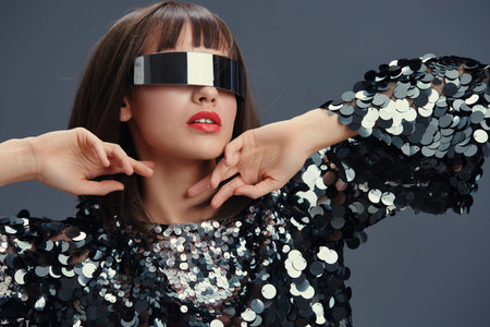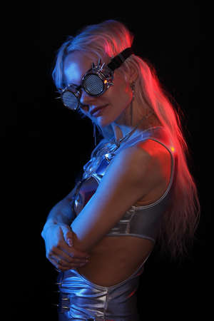 attractive peculiar woman in sci fi glasses and silver attire looking at camera on dark backdrop
