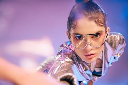 Close up of futuristic woman in holographic smart glasses