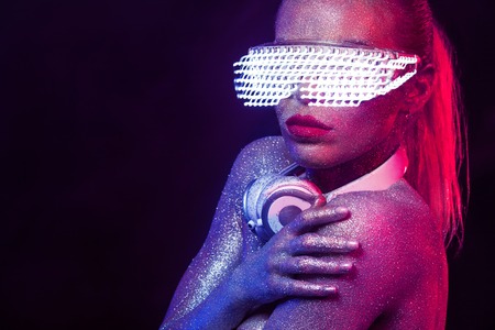Beautyful girl with glitter and sparkles on her face and body. Portrait of sexy TDJ with headphones and neon sunglasses