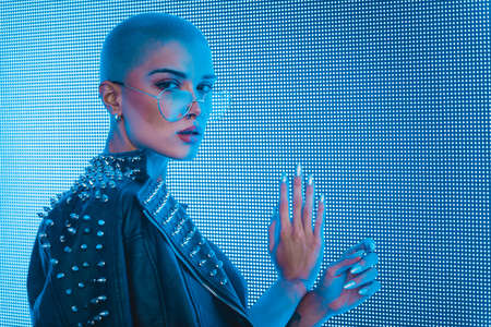 Night life. Urban fashion. Portrait of young beautiful girl in leather jacket posing over blue background with abstract neon elements.