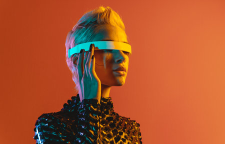 Portrait of beautiful cyber model woman posing wearing futuristic glasses on head with neon light in a virtual tech environment
