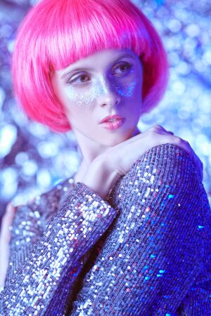 Holiday and party style. Portrait of an attractive girl with shiny glitter freckles and a bright pink wig. Beauty, makeup and cosmetics concept.