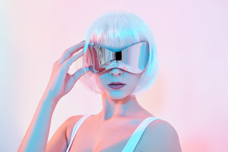 Beautiful young woman adjusting futuristic glasses against colorful background