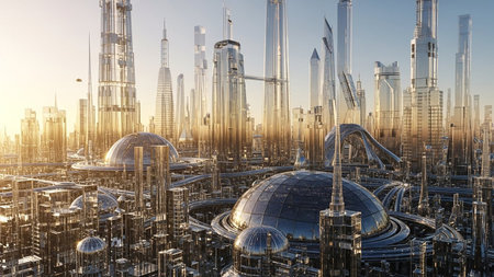 A sprawling futuristic cityscape bathed in the warm glow of sunset, featuring towering glass skyscrapers and interconnected domed structures.
