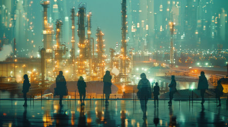 Double exposure of captivating silhouettes against a lively industrial backdrop