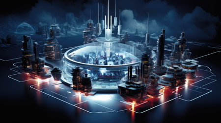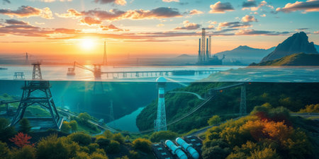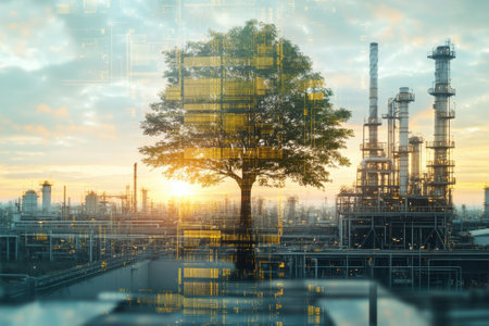 Future factory plant and inventive energy industry concept in creative graphic design. Oil, gas and petrochemical refinery factory with hologram showing next generation of power and energy business.
