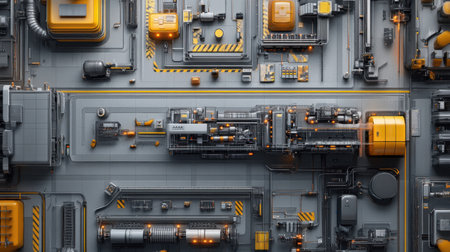 This abstract industrial layout features intricate machinery and vibrant orange elements set against a dark gray background, highlighting modern technology.