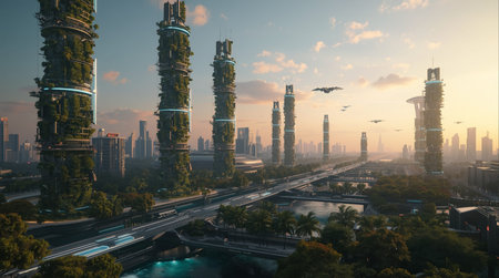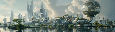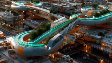 This stunning image depicts a forward-thinking urban environment featuring a modern transport system and integrated green spaces, showcasing innovation and sustainability.