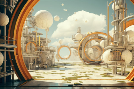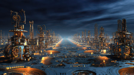 surreal landscape with repeating geometric shapes, pipes, and gears, creating a mesmerizing industrial pattern. Generative AI