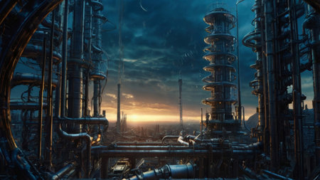 A futuristic cityscape at sunset, with towering metal structures and a vast network of pipes.
