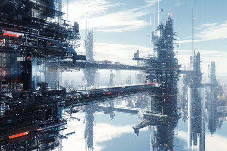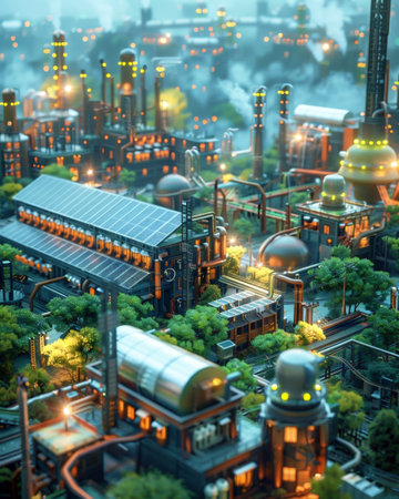 This image showcases a detailed futuristic industrial complex, featuring advanced technology, vibrant colors, and intricate architectural designs within an urban landscape.