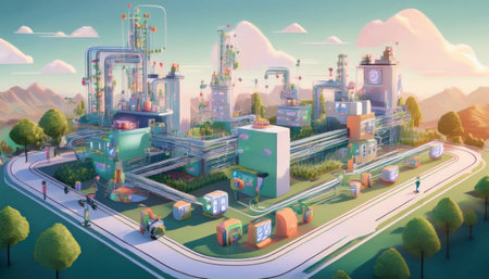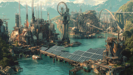 A vibrant, futuristic industrial area showcases towering structures and solar panels along a river. Lush green mountains rise in the distance, creating a stark contrast against the technology.
