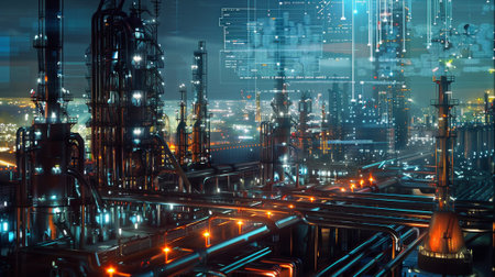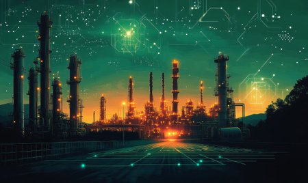 High tech industrial refinery at night with glowing lights and digital overlay conveying innovation and energy efficient process control