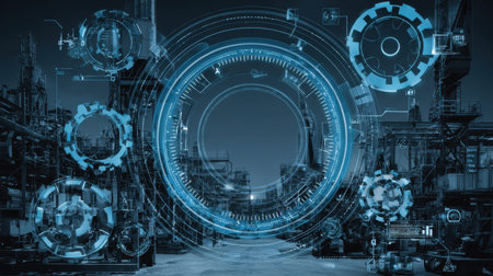 Explore a captivating industrial scene enhanced by abstract digital overlays, representing the synergy of technology, innovation, and manufacturing processes in modern settings.