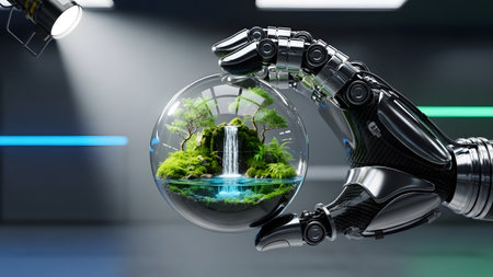 Robotic hand holding a miniature ecosystem globe with glowing core, symbolizing innovation and nature's balance