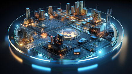 A vivid aerial view of a futuristic cityscape illuminated by warm glowing lights, showcasing intricate infrastructure and advanced technology in a modern urban environment.