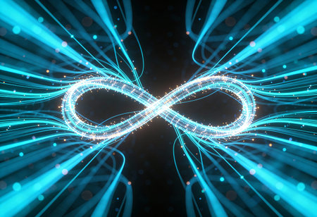 Illustration of a white infinity symbol on a dark background with a blue glow