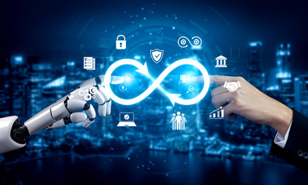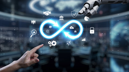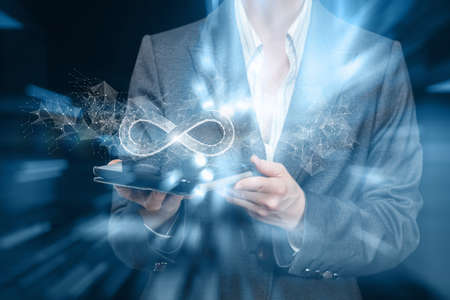 Hand holding glowing infinity symbol and software development workflow diagram. Clear details and...