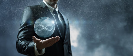 Businessman showcasing smartphone with infinity symbol, symbolizing unlimited connection in data technology, future unlimited. Infinite power, energy, internet information. technology infinity data