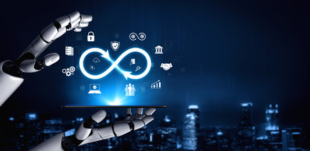 A sleek robotic hand presents a glowing infinity symbol with various digital icons related to technology and business, showcasing innovation in a high-tech environment.