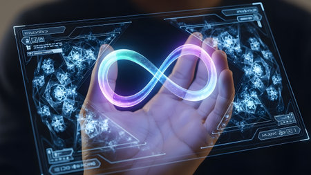 A hand holds a glowing infinity symbol on a futuristic digital display with abstract patterns.