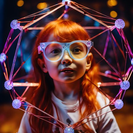 A young girl with bright red hair wears futuristic glasses and is surrounded by a glowing geometric structure with colorful lights, evoking a sense of wonder and technology in a sci-fi setting.