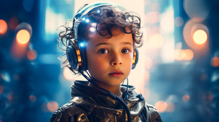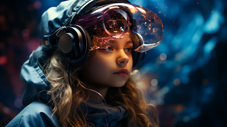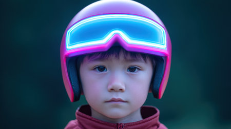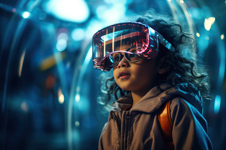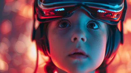 Neon Wonderland A child wearing VR glasses explores augmented reality in a vivid neon-lit environment, capturing the fusion of gadgets, virtual reality, and the exciting realm that lies ahead.