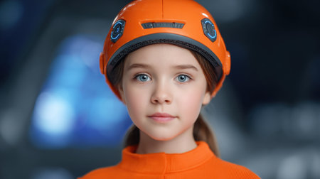 A young girl with captivating blue eyes wears a bright orange helmet, embodying the spirit of space exploration and innovation in a vibrant setting.