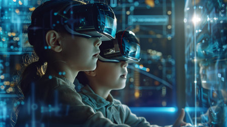 Portrait of happy smiling enthusiastic Caucasian children child, boy girl in virtual reality headset in futuristic style. Banner wearing VR glasses explores the augmented reality space of the metaverse. Games and futuristic entertainment technologies