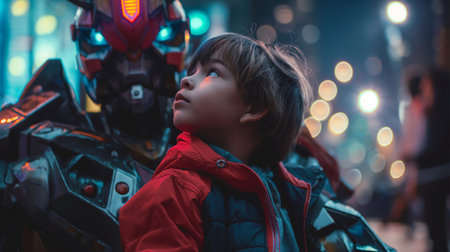 Cute little boy dressed as a robot in the city at night
