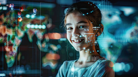 A symbolic image of a child overlaid with AI data patterns, representing early exposure to artificial intelligence, coding, and digital innovation.