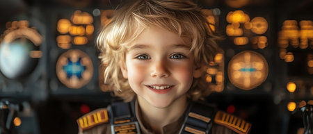 Young boy dressed as a pilot sitting in a cockpit, smiling and dreaming of flying