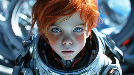 Stunning AI generated portrait of a young astronaut with vivid red hair and piercing blue eyes. The futuristic details of the spacesuit make this image captivating. Generated A.I.