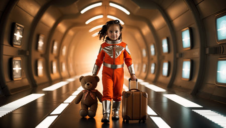 Young Astronaut Child in Spacesuit Embarking on Imaginative Space Adventure with Toy Bear and Suitcase