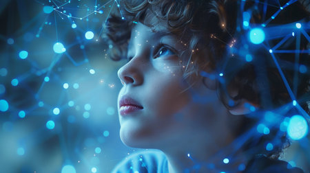 Little boy gazing thoughtfully into distance with complex, luminous network of interconnected nodes and lines. Digital neural network or constellation.