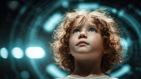 Young child with curly hair gazing upward in a futuristic environment illuminated by soft blue and white lights, representing wonder and curiosity in technology
