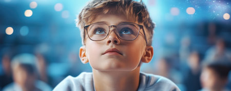 A bespectacled student, eyes wide, is engrossed in a virtual class A holographic teacher hints at a futuristic learning environment Focused lighting highlights the student amidst blurred classmates This scene depicts the next generation of education, where interactive lessons and digital instructors create an engaging and adventurous experience AI Generative