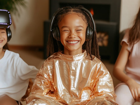 Portrait of happy smiling enthusiastic african american black children child boy girl in virtual reality headset in futuristic style. Banner wearing VR glasses explore augmented reality space metaverse. Games and futuristic entertainment technologies