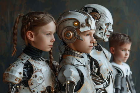 family of people and cyborg robots