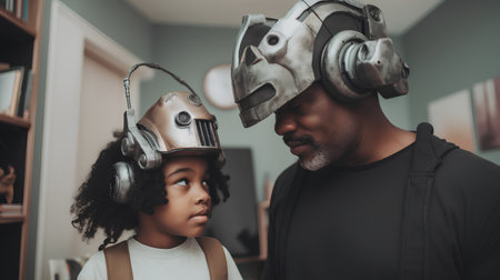 African american father and son playing with virtual reality glasses at home