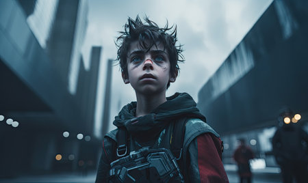 Portrait of a child boy symbolically turning into virtual human, virtual character, AI artificial intelligence.