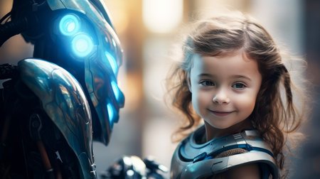 Robot cyborg girl child with artificial intelligence, future technology. Internet and digital technologies. Global network. Integrating technology and human interaction. Chat bot. Digital technologies of the future