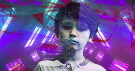 Image of neon tunnel over boy looking at camera. digital interface, communication and technology concept digitally generated image.