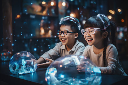 Asian children play using virtual reality equipment. The latest technologies in everyday life.