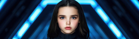 Portrait of a child girl symbolically turning into virtual human, virtual character, AI artificial intelligence.